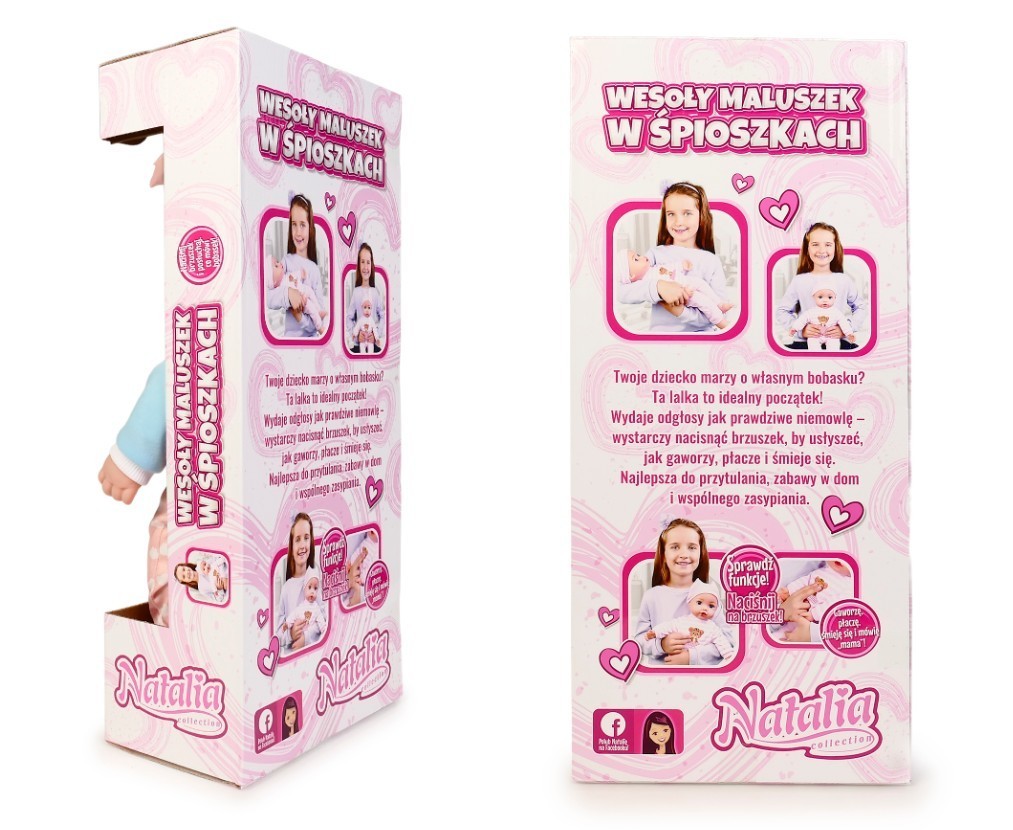 W zestawie: lalka miękka 45 cm, funkcje: naciśnięcie brzuszka aktywuje odgłosy dziecięcego śmiechu, płaczu, gaworzenia, bobas mówi "mama" i "tata".