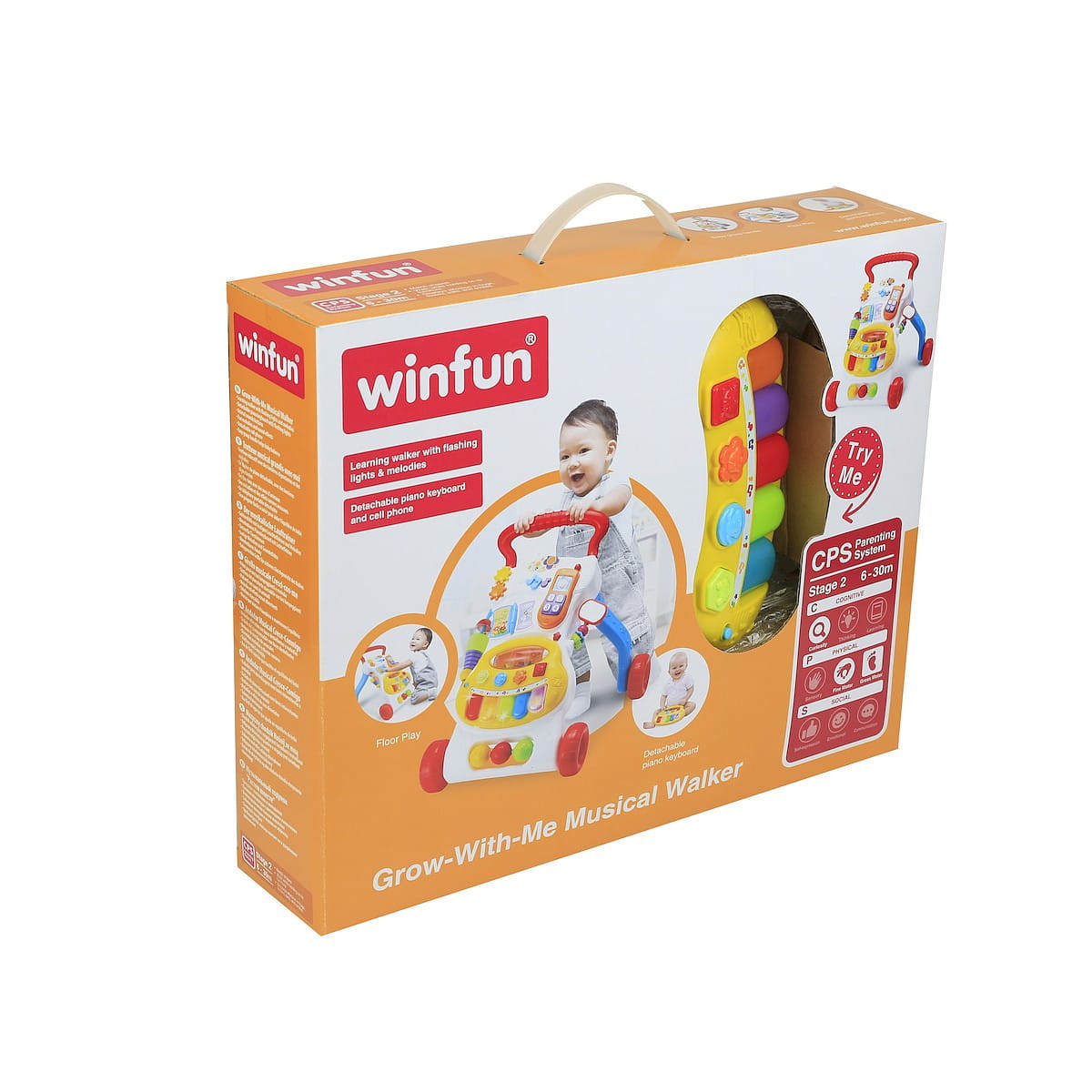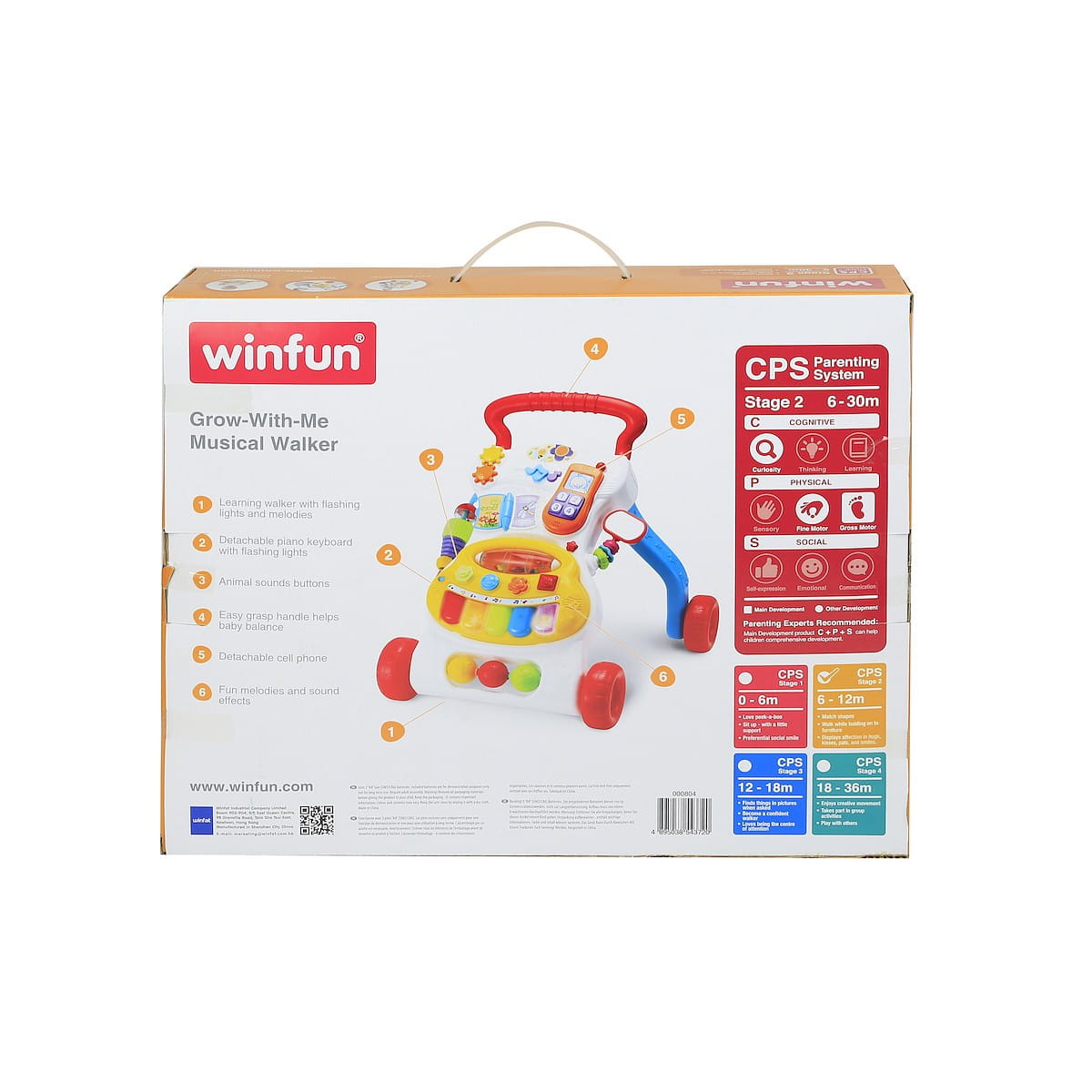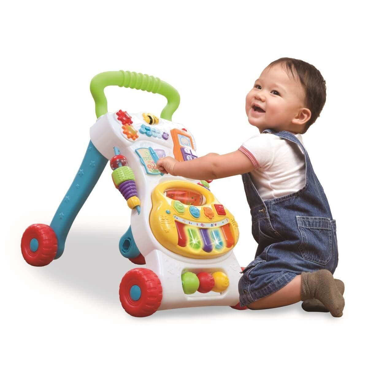 Pomimo potknięć oraz upadków dziecko nie zniechęca się i doskonali swoje kolejne kroki. Wyposażony jest dodatkowo w odłączane pianinko i telefon.