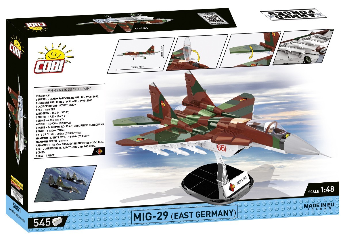MiG-29 (kod NATO: Fulcrum) to radziecki, obecnie rosyjski, współczesny myśliwiec frontowy, produkowany od 1983 roku. Niemcy Wschodnie używały tego typu maszyn od 1988 roku. Po zjednoczeniu Niemiec flota MIG-29 była nadal utrzymywana aż do roku 2002, kiedy to zostały sprzedane Polsce. Samolot z kolekcji Armed Forces został opracowany w skali 1:48 i składa się z 545 elementów. Rozmiarem pasuje do reszty klockowej kolekcji współczesnych myśliwców! Model zawiera zupełnie nowe dedykowane elementy takie stateczniki pionowe i dziób z rurką Pitota. W komplecie znajdują się tabliczka z nazwą modelu oraz podstawka ekspozycyjna. Podwozie samolotu można z łatwością odpiąć, aby wyeksponować go w locie na klockowej podstawce z przezroczystym trzpieniem. Nasz klockowy MIG-29 ma 35,5 cm długości i 23 cm rozpiętości skrzydeł. Dzięki intuicyjnej instrukcji opartej na czytelnych ikonach budowa jest prosta. Ten model to pozycja obowiązkowa dla wszystkich fanów lotnictwa, militariów i techniki wojskowej.