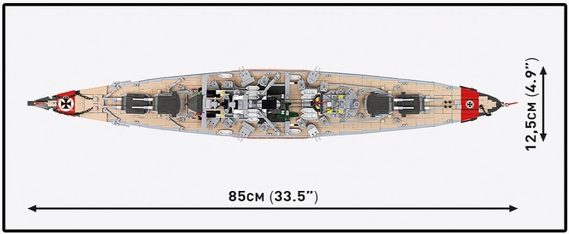 Wymiary gotowego modelu sprawiają, że jest to jeden z najbardziej efektownych zestawów okrętowych w ofercie COBI w skali 1:300.