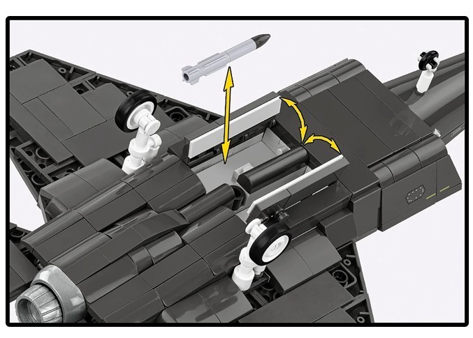 Gumowe opony i ruchome elementy - Zestaw nie tylko wygląda świetnie, ale także oferuje pełną mobilność. Samolot ma obracane gumowe opony, otwieraną kabinę pilota, ruchome elementy sterownicze i otwierany luk bombowy.