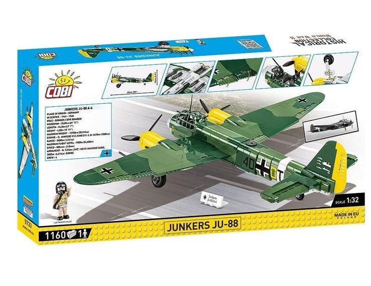 Bombowiec Ju 88 to prawdziwy hit wśród ogromnych samolotów od COBI i gwiazda Kolekcji Historycznej poświęconej drugiej wojnie światowej. Ju 88 to niemiecki dwusilnikowy samolot o wszechstronnym zastosowaniu! Nie bez powodu nazywany był niemieckim Mosquito. Śmiało można go porównać z Zachodnim de Havilland Mosquito, który również znajduje się w ofercie COBI! Ju 88 został zaprojektowany jako szybki bombowiec i doskonale się spisywał w atakach z niewielkiej wysokości i płytkiego lotu nurkowego. Mógł też pełnić funkcję nocnego myśliwca, bombowca torpedowego i samolotu rozpoznawczego. Był jednocześnie jednym z najpopularniejszych samolotów II wojny światowej! W latach 1939 - 1945 wyprodukowano niemal 15 tysięcy egzemplarzy tej maszyny w wielu wersjach.