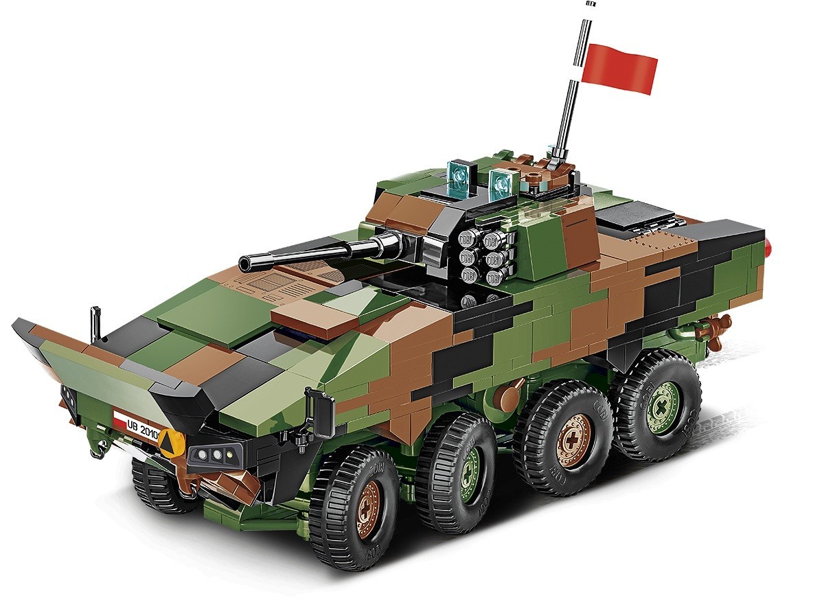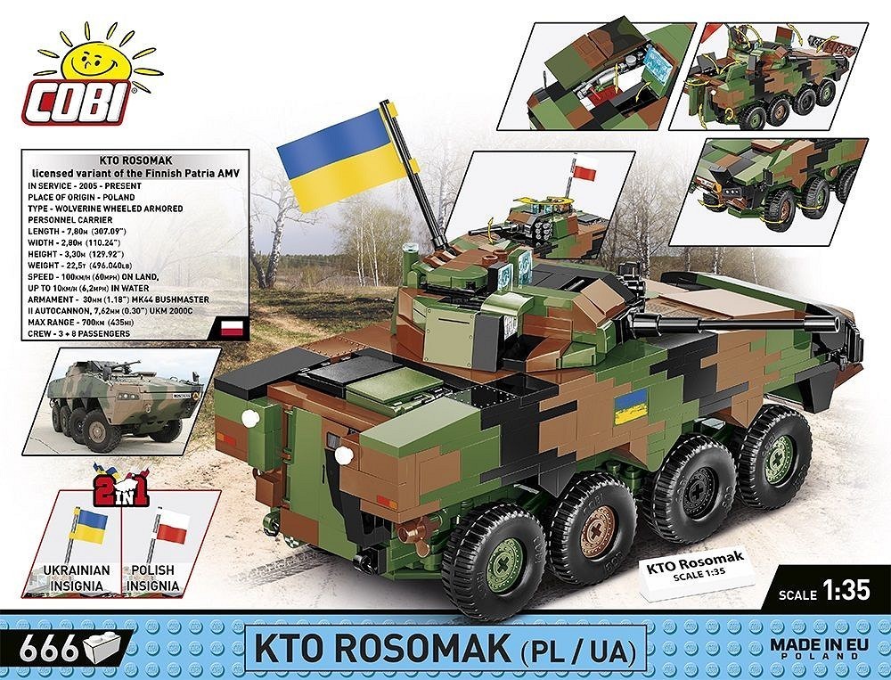 Klockowy model szczegółowo odwzorowany w skali 1:35 doskonale uzupełnia kolekcję pojazdów lądowych wydawanych w ramach serii COBI Armed Forces. Zestaw został wydany na licencji przedsiębiorstwa ROSOMAK SA z Siemianowic Śląskich, gdzie produkowany jest oryginalny pojazd! Model posiada skrętne osie kół, otwierane włazy oraz nadrukowane szczegółowe oznaczenia Wojska Polskiego. Do zestawu dołączone są również dwie klockowe flagi odpowiednio dla krajów, które użytkują tego typu pojazdy (Polska i Ukraina). Klockowa tabliczka zawiera nadrukowaną nazwę pojazdu i można ją wyeksponować obok modelu! Zbuduj współczesny transporter kołowy Wojska Polskiego!