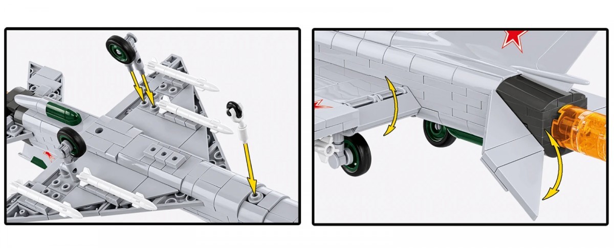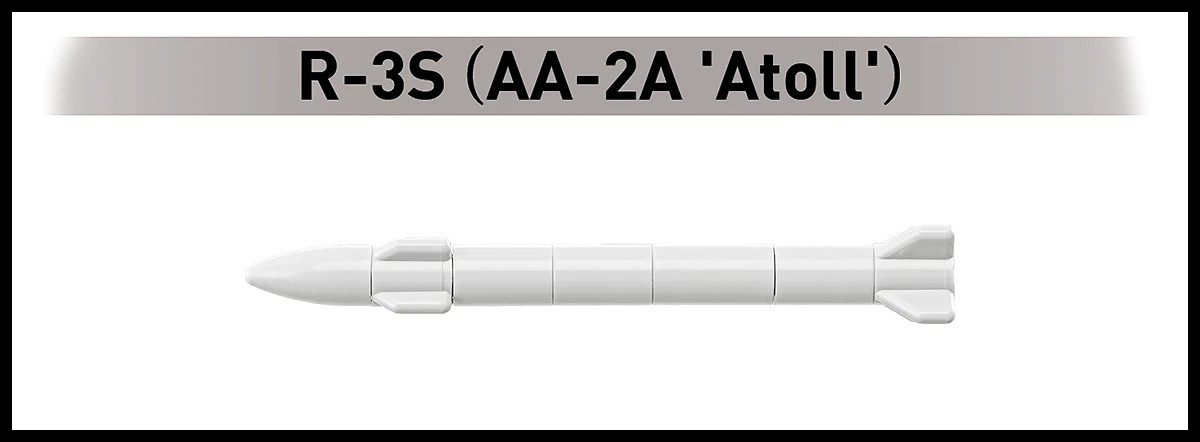 - Realistyczna funkcjonalność - model posiada ruchome elementy sterujące, odczepiane koła i odwzorowany płomień z silnika odrzutowego, co pozwala odtwarzać sceny startu, lotu i lądowania. Pod skrzydłami umieszczone ma repliki rakiet R-3S. To radzieckie, kierowane pociski powietrze-powietrze krótkiego zasięgu, będące kopią amerykańskiego pocisku AIM-9B Sidewinder.
