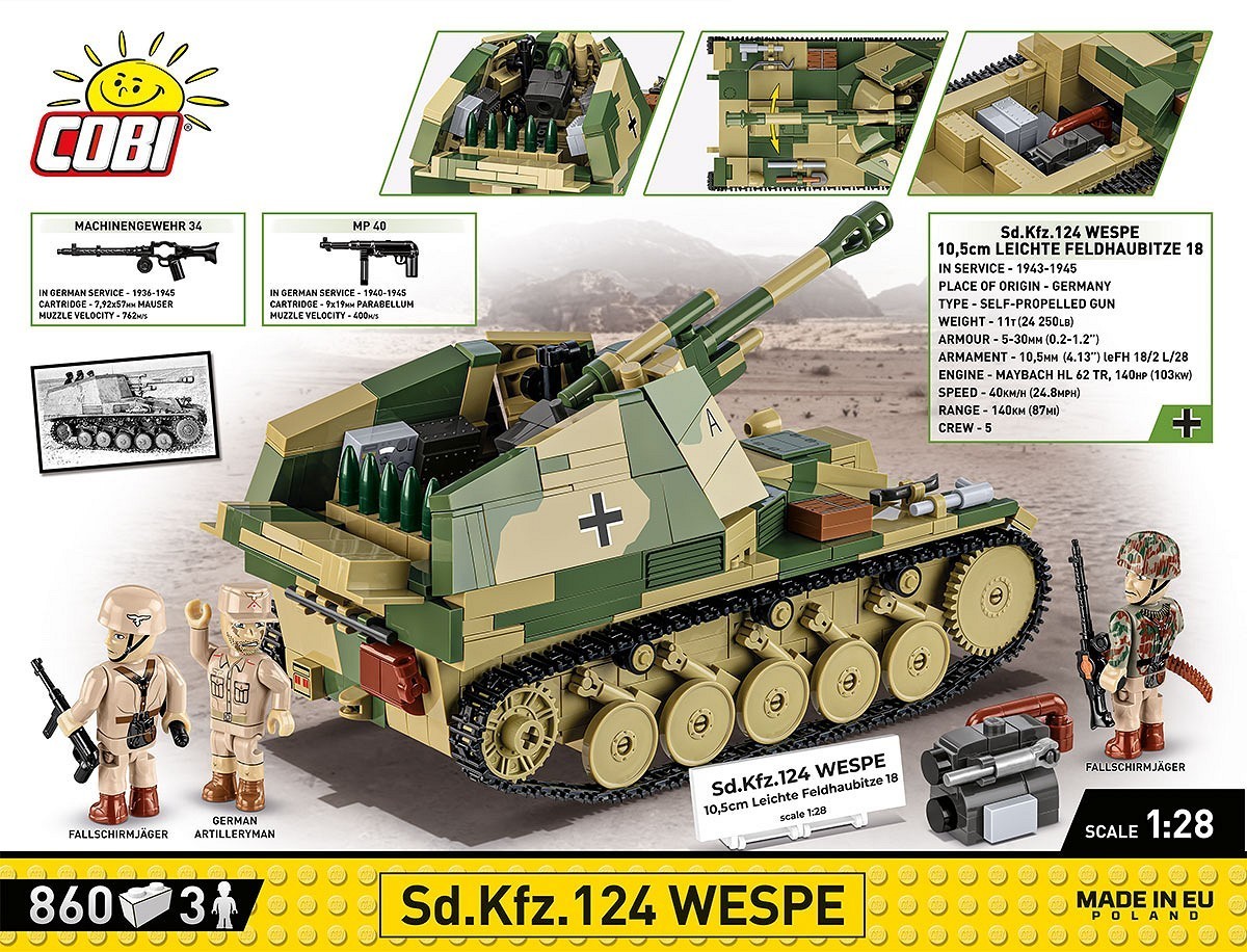 Coś, na co czekali od dawna fani historycznych zestawów od COBI. Do rodziny pojazdów na podwoziu czołgu Panzer II dołącza działo samobieżne Wespe. Była to doskonała hybryda sprawdzonego podwozia i skutecznej haubicy 10,5cm leFH 18. Model w Executive Edition składa się 855 elementów i zaprojektowany jest w modelarskiej skali 1:28. Cechą wyróżniającą zestaw jest kolorowy kamuflaż kontrastujący z szarością standardowych Panzerów II, przygotowanych we wczesnowojennych, szarych barwach. Klocki zawierają wysokiej jakości nadruki, które nie ścierają się w trakcie zabawy. Przedstawiają one piaskowo-zielony kamuflaż, wizjery, oznaczenia oraz elementy konstrukcyjne takie jak wentylatory i wywietrzniki. Model posiada wyjmowany klockowy silnik i białą tabliczkę z nazwą zestawu. Do zestawu dołączone są wyjątkowo ciekawe figurki: artylerzysta oraz dwóch spadochroniarzy. Wszystkie figurki mają tropikalny kamuflaż z silnymi piaskowymi akcentami, co wskazuje, że przedstawiony pojazd walczy na Półwyspie Apenińskim!
