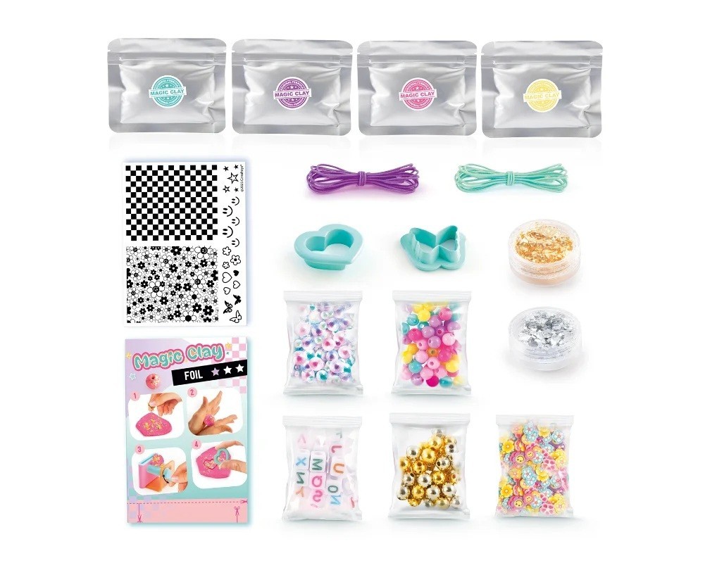 Akcesoria w zestawie: 4 x Woreczek masy w różnych kolorach 5 x Woreczek z koralikami i ozdobami Arkusz ze wzorkami do odbicia 2 x Słoiczek z folią dekoracyjną 2 x Sznurek 2 x Foremka Instrukcja i karta obrazkowa z inspiracją