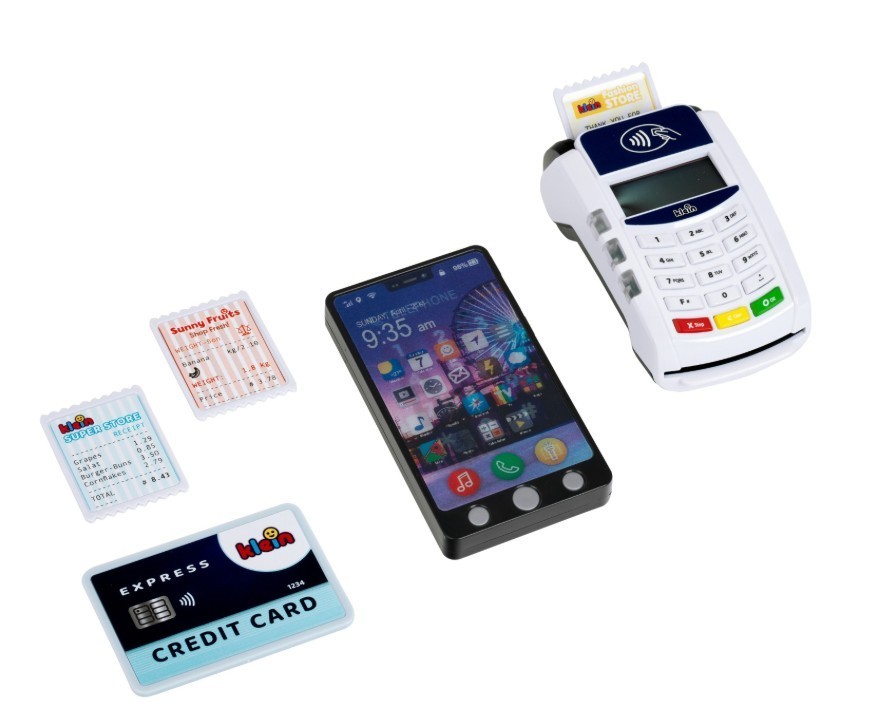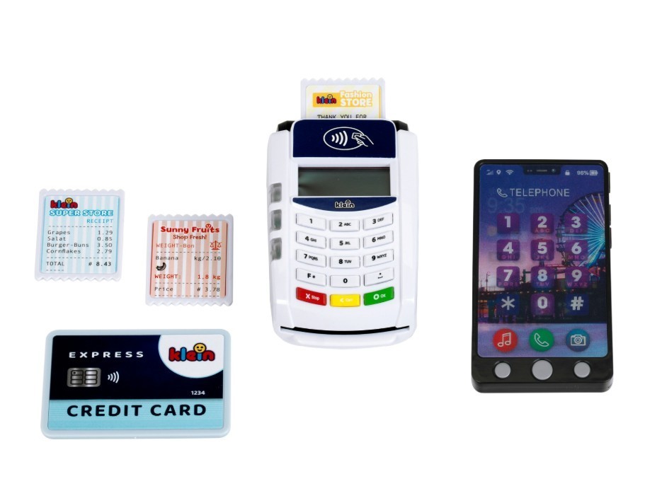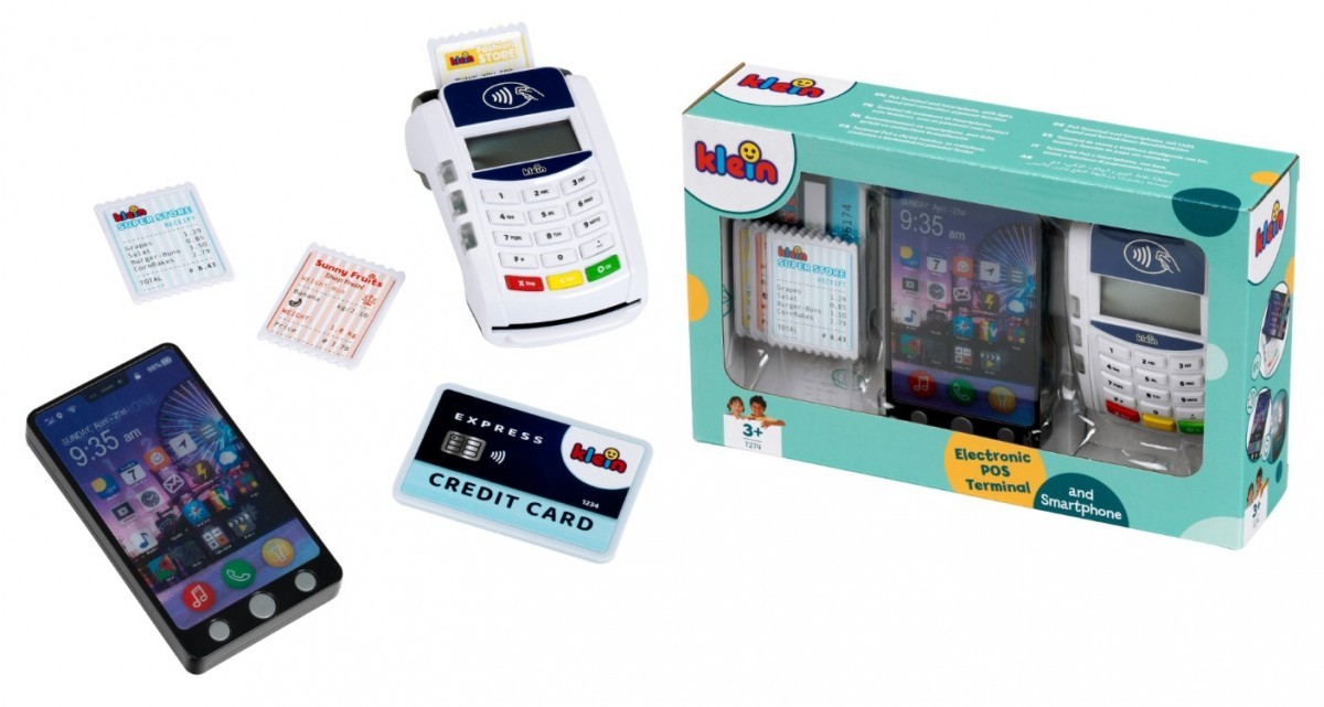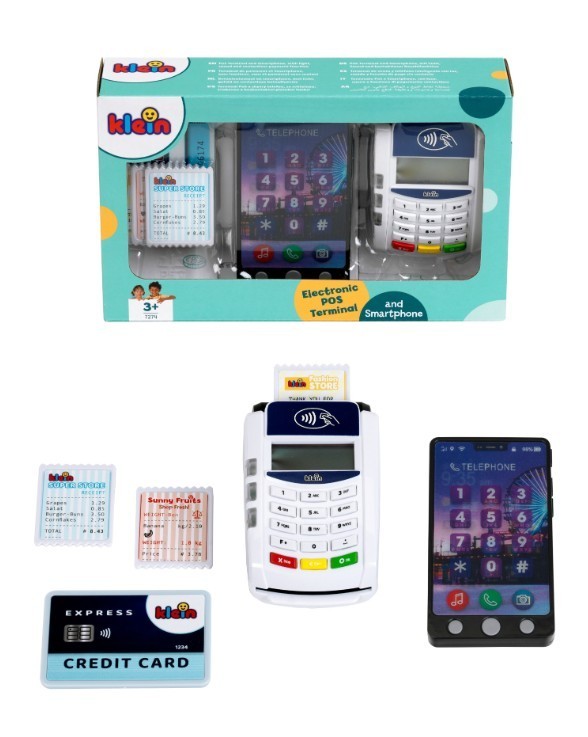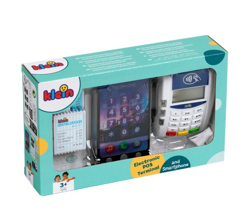 Z terminalem ze smartfonem od Klein mali sprzedawcy staną się profesjonalistami w odgrywaniu ról! Zestaw zawiera realistyczny terminal PoS, w którym można dokonywać płatności kartą kredytową lub smartfonem. Gniazdo na kartę kredytową z towarzyszącym dźwiękiem zapewnia autentyczną zabawę. Dołączony smartfon zachwyca 3 przyciskami z różnymi dźwiękami i latarką funkcja płatności zbliżeniowych dopełnia zabawę. Dzięki akcesoriom, takim jak karty paragonowe i karta kredytowa, dzieci mogą nauczyć się korzystać z nowoczesnej technologii płatności w zabawny sposób. 7-częściowy zestaw zawiera terminal PoS, dziecięcy telefon komórkowy z funkcjami światła i dźwięku, kartę kredytową z funkcją płatności zbliżeniowych oraz trzy karty paragonowe idealne do pomysłowej zabawy w odgrywanie ról. Zabawka wspomaga wyobraźnię, sprawność motoryczną i umiejętności niezbędne we wczesnym dzieciństwie poprzez zabawne zakupy i płatności Specyfikacja: Wymiary: 20 cm x 12 cm x 5 cm Odpowiedni dla dzieci w wieku od 3 lat Wymagane baterie: 6x R03-AAA (Micro) brak w zestawie