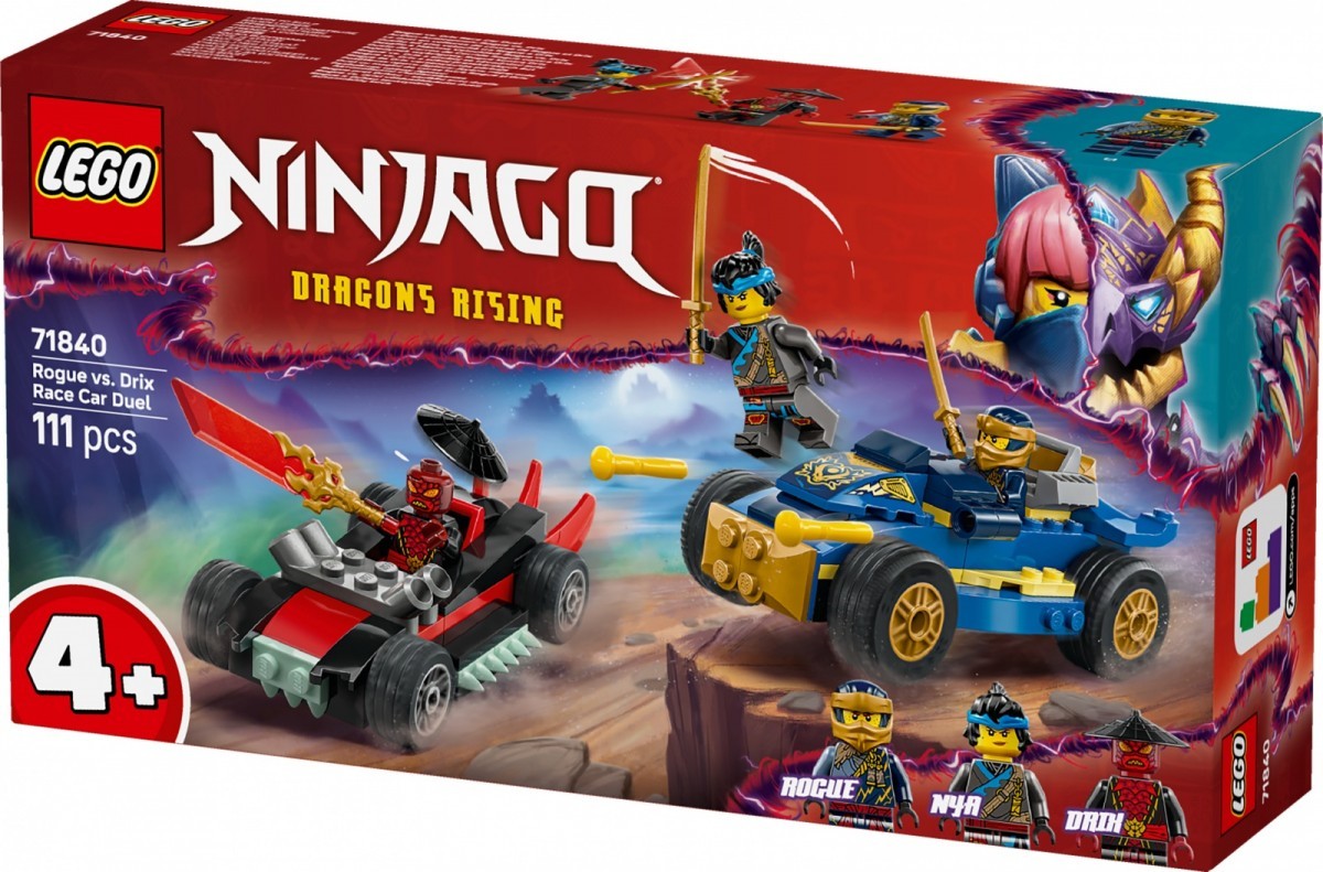 Podaruj małym fanom ninja zestaw LEGO NINJAGO Pojedynek wyścigowy Rogue kontra Drix (71840) pełen akcji model do zbudowania i zabawy inspirowany trzecim sezonem serialu NINJAGO: Powstanie Smoków. Został zaprojektowany z myślą o dzieciach w wieku od czterech lat, które uczą się budować i rozwijać kreatywność.
