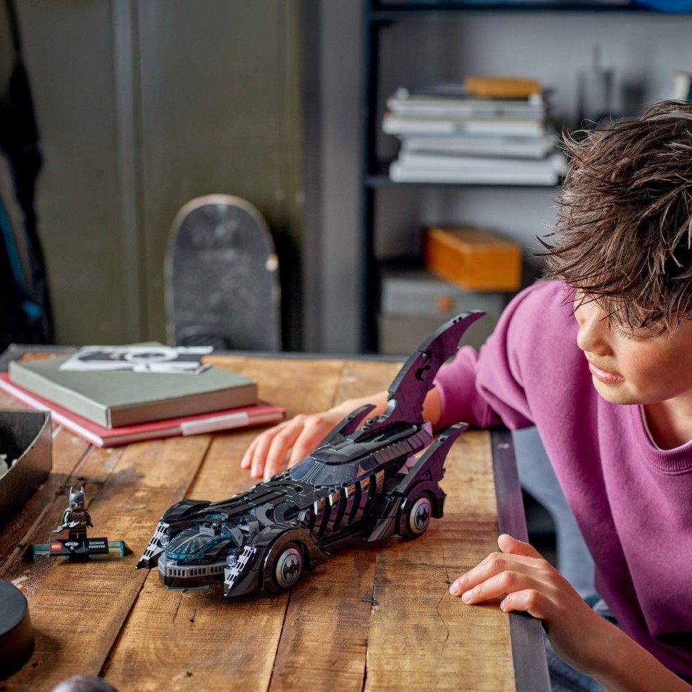 Ta realistyczna replika kultowego samochodu z filmu Batman Forever ma formowaną przednią szybę, ruchome koła, ozdoby i kokpit, który otwiera się, odsłaniając szczegółowe wnętrze. Zestaw zawiera również minifigurkę Batmana ze specjalną podstawką. Aby zapewnić dodatkową cyfrową zabawę, konstruktorzy mogą powiększać, obracać modele w 3D i śledzić swoje postępy za pomocą intuicyjnej aplikacji LEGO Builder. Zestaw zawiera 909 elementów.