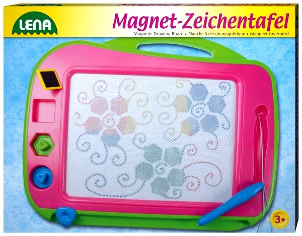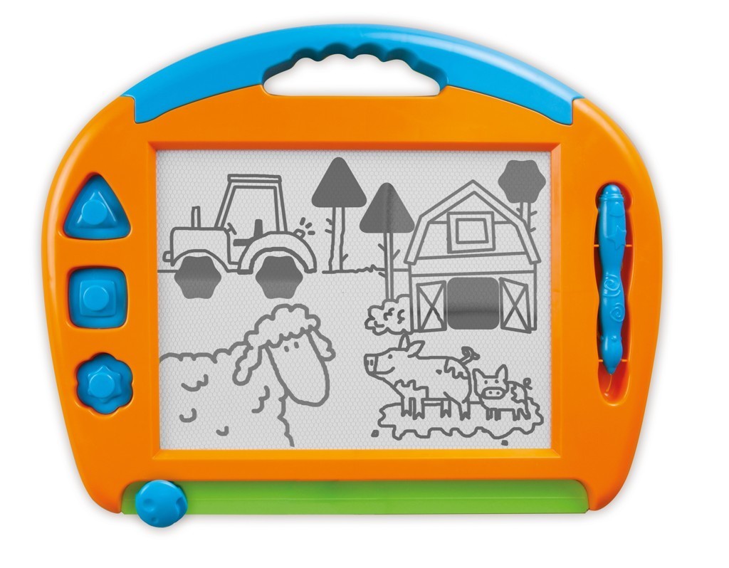 Magnetyczny znikopis o szerokości 41 cm. W zestawie znajdują się 3 stempelki o różnych kształtach. Aby zlikwidować obrazek należy jedynie przesunąć suwak, znajdujący się poniżej tablicy, przez całą jej długość. Zabawka ma wygodny uchwyt do przenoszenia i specjalny długopis do rysowania.