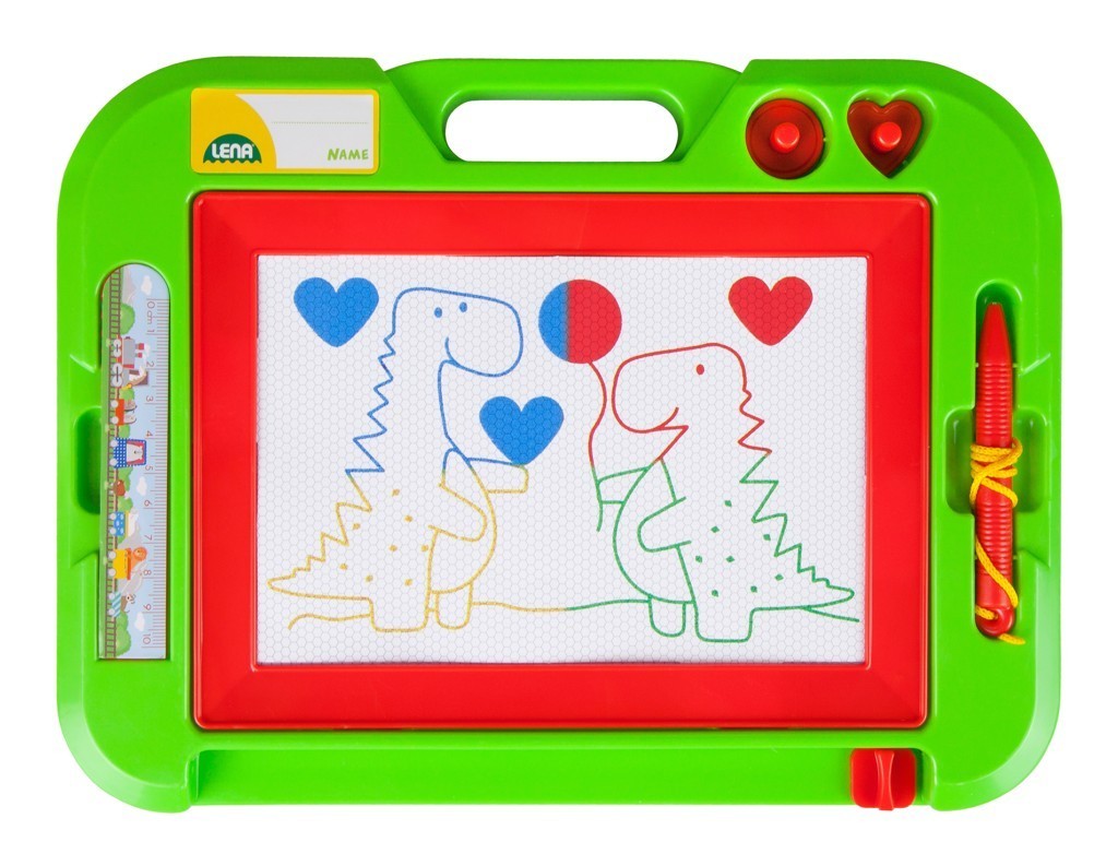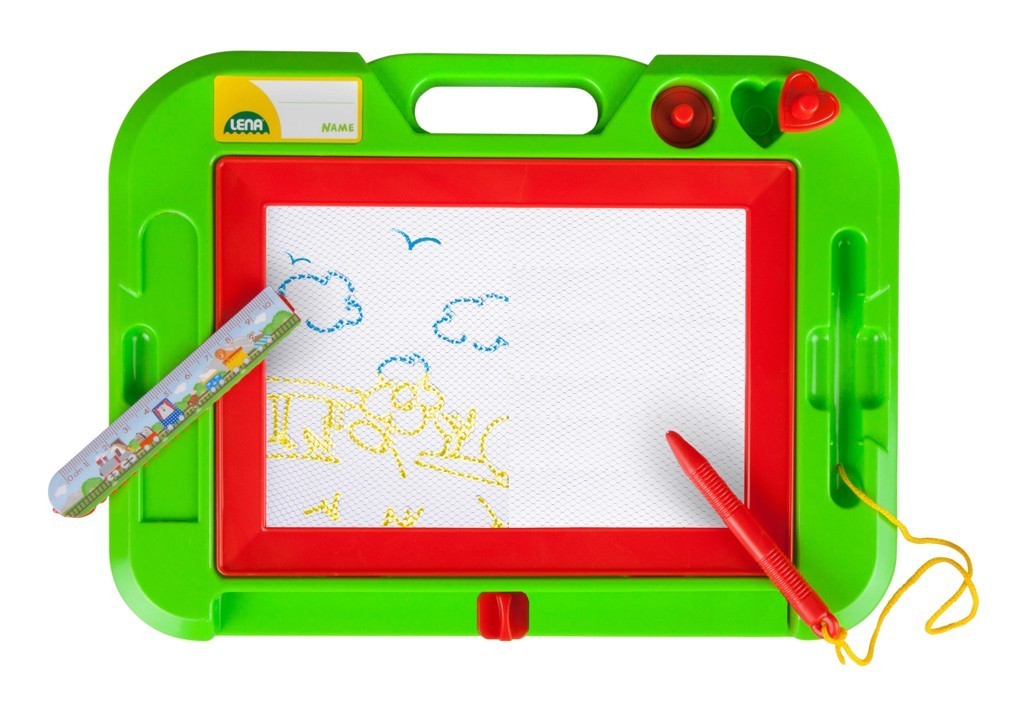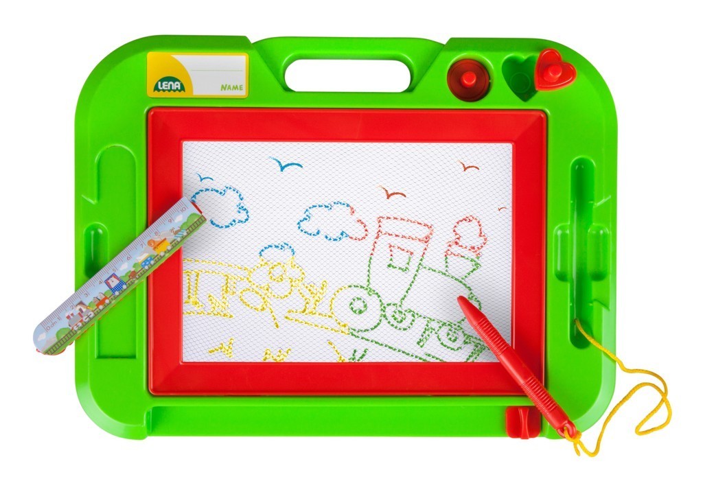 Magnetyczny znikopis w kolorze zielonym z elementami koloru niebieskiego i pomarańczowego, szerokość 32 cm. Produkt ten jest innowacyjny, ponieważ powstający obrazek jest kolorowy. Dodatkowo w zestawie znajdują się 2stempelki o różnych kształtach. Aby zlikwidować obrazek należy jedynie przesunąć suwak, znajdujący się poniżej tablicy, przez całą jej długość. Zabawka ma wygodny uchwyt do przenoszenia i specjalny długopis do rysowania. Zabawka przeznaczona: dla dzieci w wieku od 3 lat.