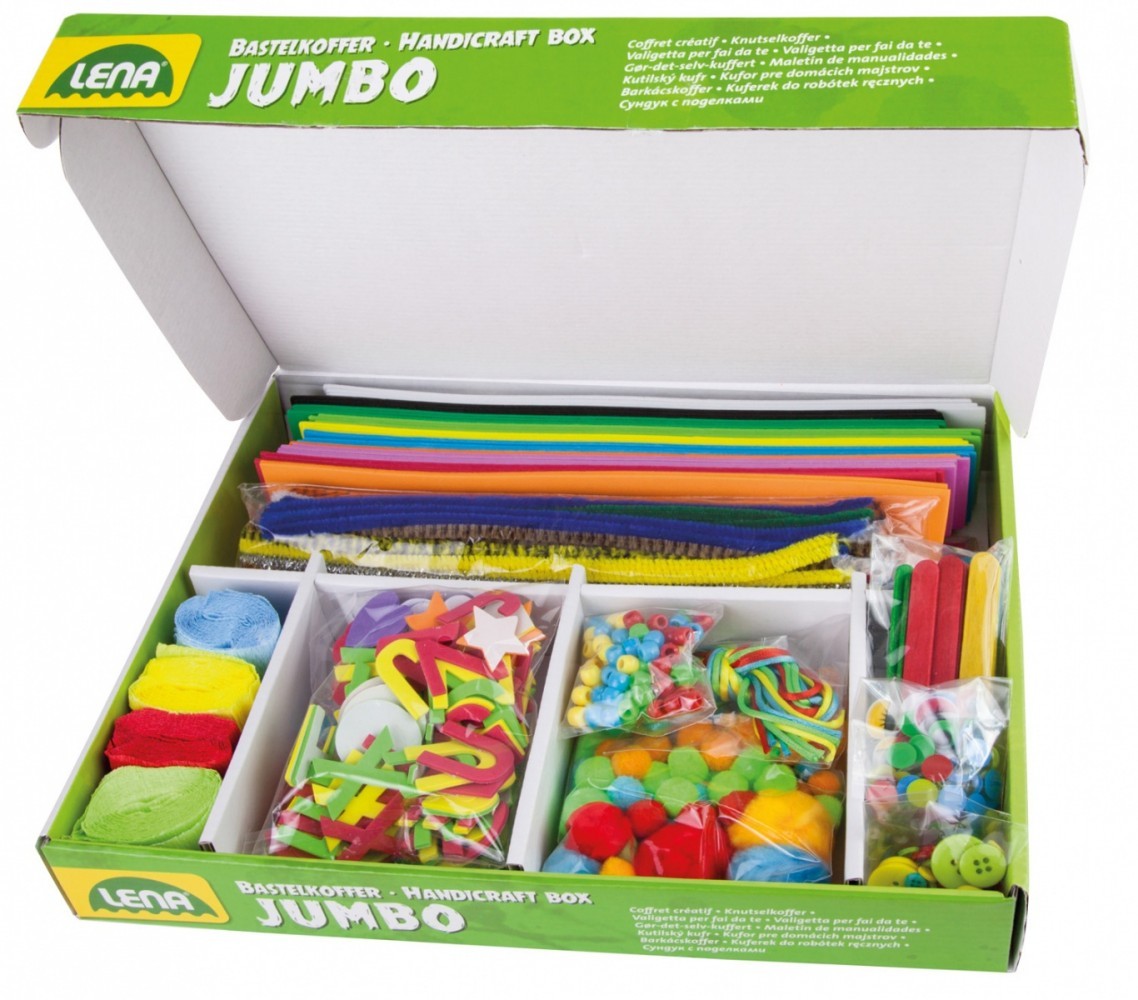 Walizka LENA Jumbo. Pudełko zawiera kolorowy papier, części z gumy piankowej, czyściki do fajek, ruchome oczy, pompony, taśmę maskującą, kolorowe patyczki do lodów, guziki i wiele więcej - 800 części. Odpowiedni dla dzieci powyżej 5 lat. Zapakowany w składane pudełko z informacją o produkcie.