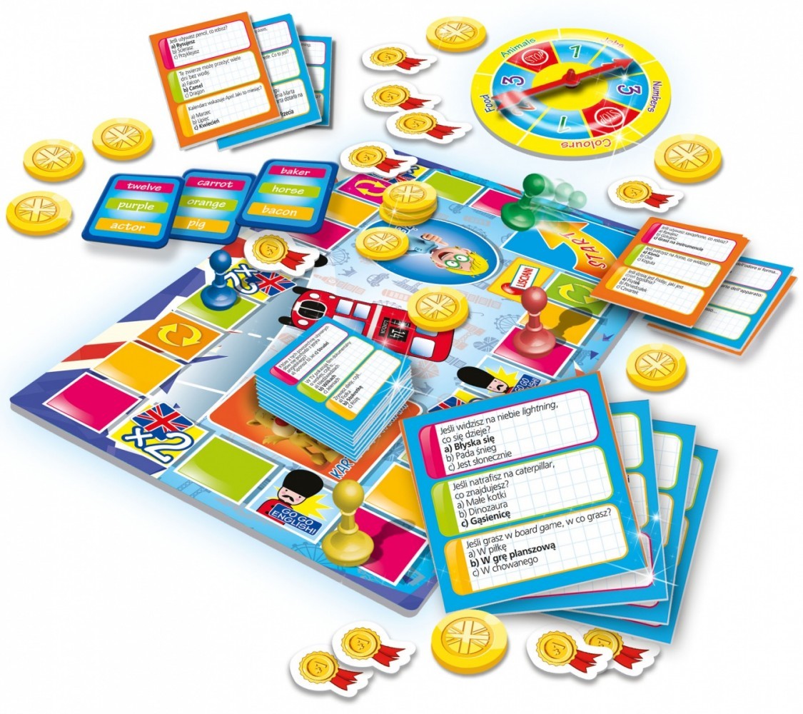 Gra rozwijająca słownictwo i wiedzę z języka angielskiego. W grze odpowiadamy na pytania i przesuwamy swój pionek po planszy, zdobywając przy tym specjalne odznaki. Quiz z pytaniami został przygotowany na podstawie programu nauczania w szkole podstawowej i jest podzielony na dwa poziomy trudności, dzięki czemu młodsze i starsze dzieci mogą razem spędzać czas przy planszy. Opakowanie zawiera instrukcję.