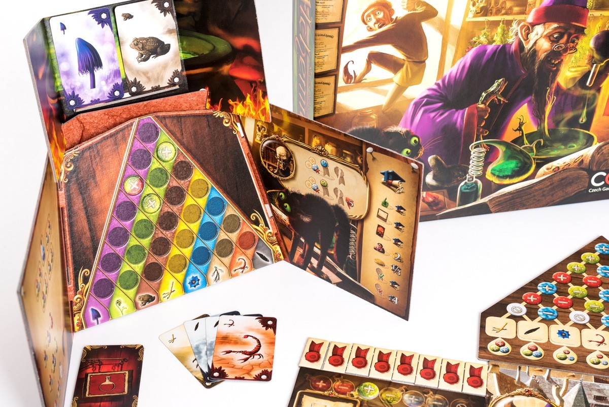 Akcesoria w zestawie: Dwustronna plansza do gry Plansza teorii Plansza prezentacji 4 zasłonki laboratorium 4 trójkąty wyników 4 plansze graczy 6 kafli poszukiwaczy przygód 2 kafle konferencji 5 kafli stypendiów 8 żetonów alchemonów 104 żetony wyników 36 żetonów sztuk złota 44 żetony pieczęci (zestaw 11 w każdym kolorze) 6 żetonów konfliktów Znacznik gracza startowego 8 kafli składników Plansza mistrza gry 40 kart składników 22 karty przysług 18 kart artefaktów 16 kart ofert 8 plastikowych flakoników (2 w każdym kolorze) 24 plastikowe znaczniki (6 w każdym kolorze) Blok z tabelami dedukcji 2 pojemniki na żetony 8 woreczków strunowych Instrukcja