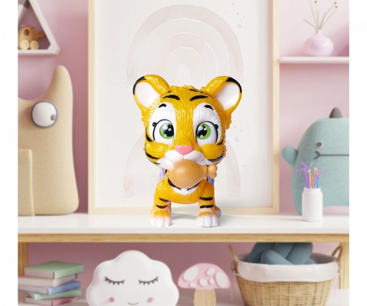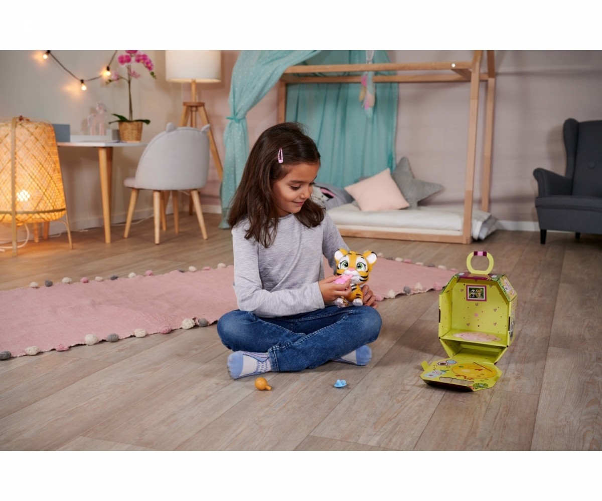 Moc niespodzianek: oprócz Tygryska o wielkości 15 cm znajdują się trzy niespodzianki do pielęgnacji i karmienia oraz akt adopcji, tygrysek potrafi trzymać akcesoria w pyszczku.
