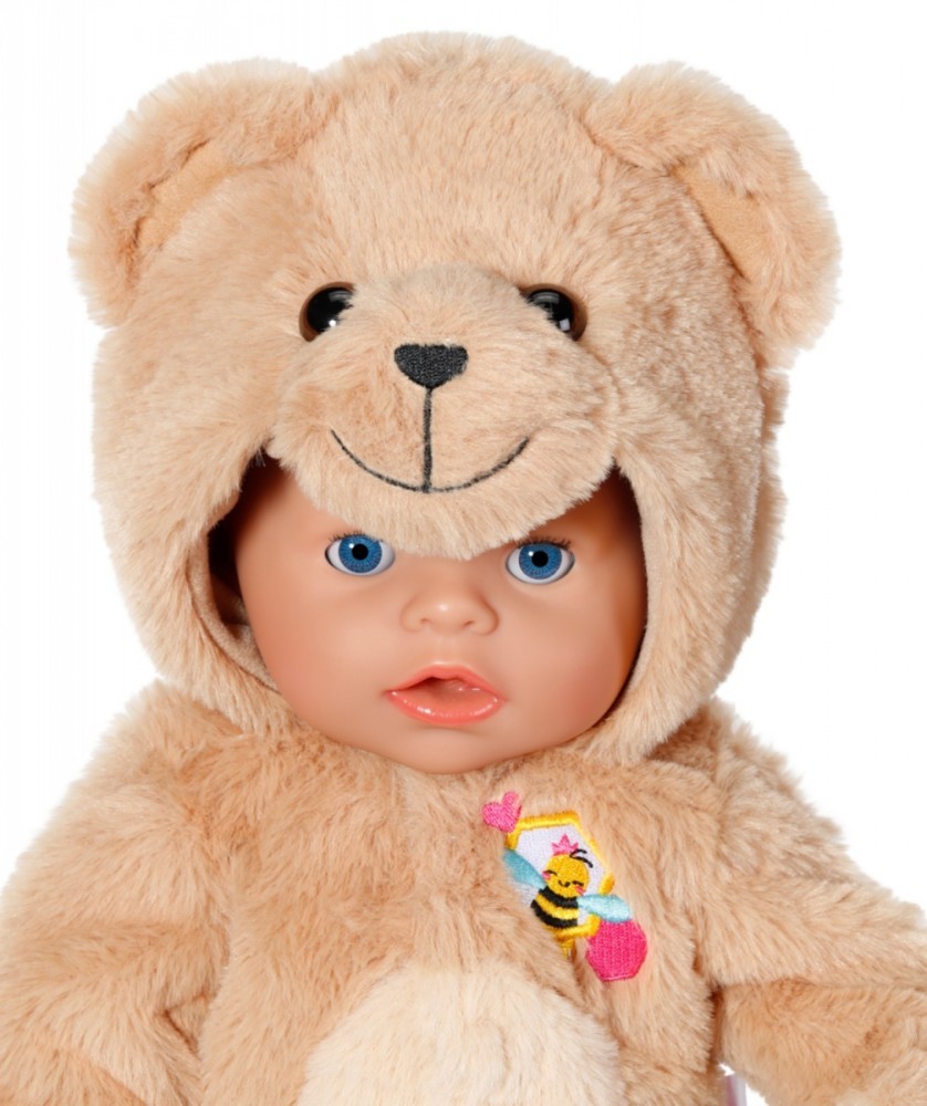 Czy to mały miś? Nie, to Baby Born! W swoim uroczym kombinezonie z misiem wygląda zupełnie jak jej najlepszy przyjaciel Teddy! W kombinezonie wykonanym z niezwykle miękkiego, przytulnego materiału z kapturem w kształcie misia może bawić się z misiem po lesie i wspólnie odkrywać jego niedźwiedzi świat.